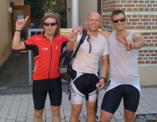 Bis dahin hat immer noch ein Teilnehmer aus unserer Gruppe gefehlt. Der Jan war nach 04:50 immer noch nicht im Ziel, so langsam wurden wir nervös. Ich hatte kein Handy dabei, und Uwe´s Handy war in meinem Auto, den Schüssel hatte aber Uli´s Frau, die Nervosität stieg so langsam weiter. Endlich hatten wir ein Handy mit Jan´s Nummer drin aufgetrieben und haben ihn auch erreicht. Er lag im Sanitätszelt mit Verdacht auf Bruch des linken Mittelfingers. Also alle Mann ab ins Sani-Zelt, da lag er dann auch relativ relaxed mit ner Infusion und einem dicken schiefabstehenden Finger. Er ist im Ziel beim Zielspurt mit einem anderen Teilnehmer der von rechts nach links rübergezogen ist zusammengeknallt und mit dem Finger in der Absperrung hängengeblieben. Bis auf den Finger der nur ausgekugelt war und einen Platten am Radel war aber alles in Ordnung wie sich später herausstellen sollte.