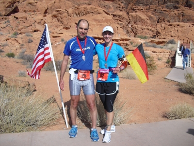 Von jetzt an konnte ich wieder einige Läufer überholen, die während meiner Fotostopps und ausgiebigen Verpflegungspausen an mir vorbeigelaufen waren. Darunter befand sich auch Ivonne, eine nach Las Vegas ausgewanderte Landsfrau. Für Ivonne war der VoF Marathon die Marathonpremiere. Respekt, und das bei so einem Höhenprofil! Ich beschloss kurzerhand, Ivonne ins Ziel zu begleiten. Immerhin lagen noch knapp 7 km vor uns und etwas Unterhaltung schien uns beiden gut zu tun. Ohne große Zwischenfälle kamen wir ins Ziel. Lisa und Konni erwarteten uns bereits kurz vorher zu einem Fotoshooting. Ich schnappte mir noch eine kleine deutsche Flagge und gemeinsam mit Ivonne finishte ich in 4:38 Std. So lange war ich noch nie bei einem Marathon unterwegs gewesen. Stefan benötigte sogar über 5 Stunden für den Lauf. Auch die beiden Mädels hatten bei ihren Halbmarathons nicht mit dem Tempo übertrieben. Vollends zufrieden fuhren wir alle Vier dann anschließend im "Abgehts09-Mannschaftsbus" nach Las Vegas weiter.