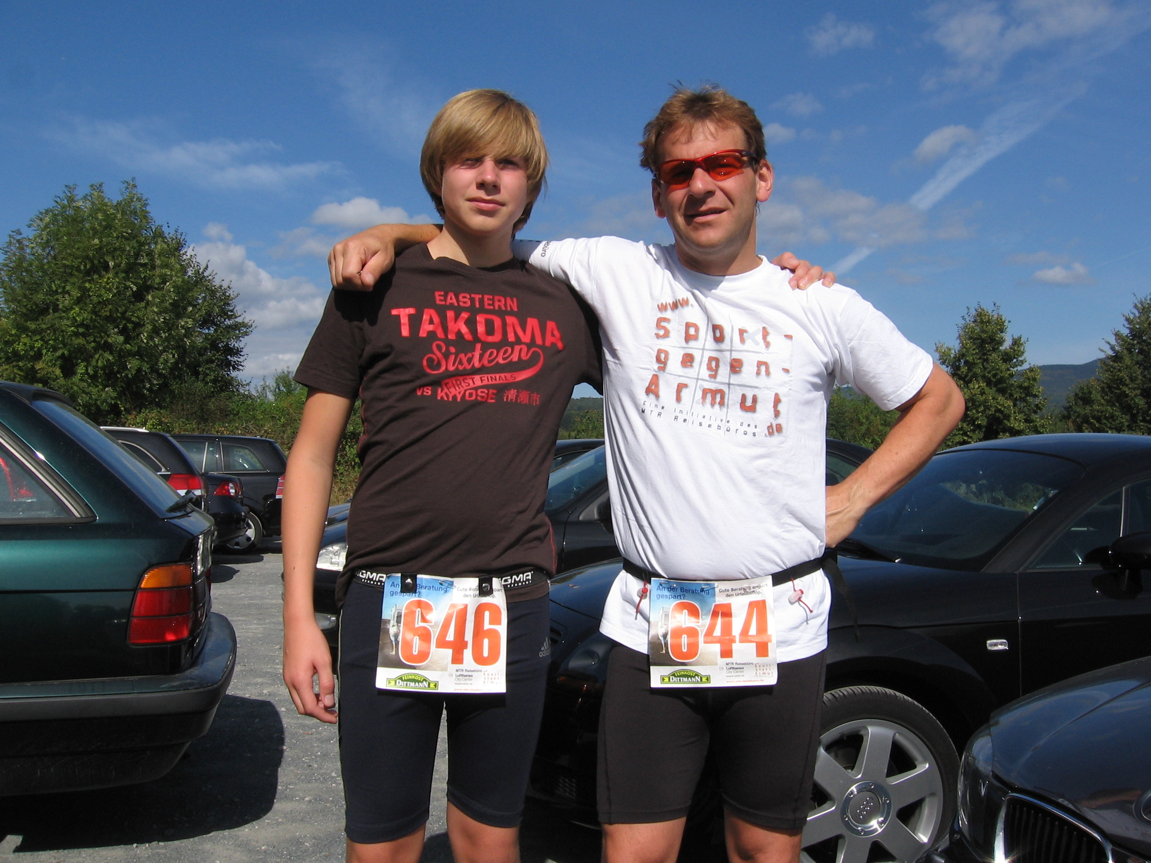 Doch obwohl es jetzt fast nur noch bergab ging, war der letzte Kilometer sehr anstrengend. Mit schlappen Beinen quälte ich mich ins Ziel. Auf den letzten Metern gewann ich noch den Zielsprint gegen Thorsten.