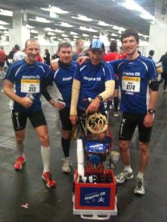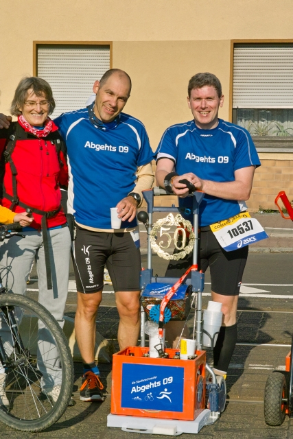 Ich fand den Lauf in Frankfurt richtig klasse. Wiederholung - nein danke! Für mich bleibt es eine einmalige Aktion. Vielen Dank an Stefan, denn ohne seine Begleitung hätte ich wahrscheinlich den Karren bei km 26 abgegeben. Zu zweit war das Vorhaben wirklich gut durchführbar und viel lustiger.. Wir können erneut bestätigen, dass wir mit dem Marathon am Main eine super Veranstaltung direkt vor der Haustür haben.