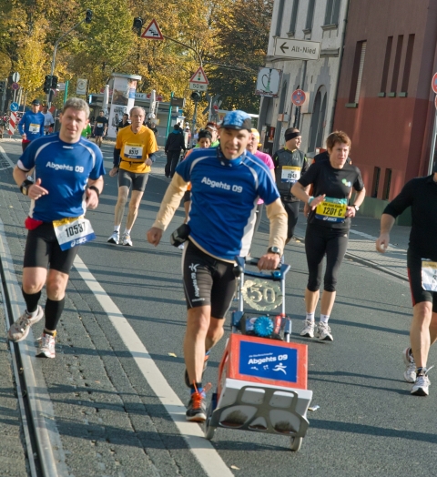 Es ging los und wir schlängelten uns mit dem Wagen durch viele Läufer hindurch. Stefan wunderte sich sehr über das anfänglich sehr langsame Tempo unserer Mitläufer. Die ersten Kilometer mit dem Sackkarren haben wir ganz der Sicherheit gewidmet. Wir wechselten uns jeden Kilometer fliegend mit dem Anschubsen der Karre ab. Während der eine schob, sicherte der andere die Strecke, so dass wir keinen der Mitläufer gefährden konnten. Wenn gar nix mehr half, bedienten wir uns der an dem Karren angebrachten Fahrradhupe. Dann war der Weg meist schnell wieder frei. Nach 5 Kilometer hatten wir einen Gesamtschnitt von 5:52 Min/km erreicht. Dieses Tempo war natürlich auf Dauer viel zu schnell und wir versuchten das Tempo zu drosseln. Uns machte der Lauf bis jetzt ziemlich viel Spaß. Von überall her vernahmen wir sehr positive Reaktionen auf den Lauf mit dem Gefährt. Die Zuschauer und Läufer waren sehr amüsiert darüber und feuerten uns kräftig an.