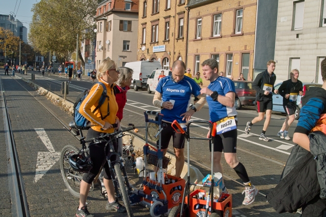 Da ja heute auch Helloween war, beglückten Stefan und ich die am Streckenrand verweilenden Kids mit den kleinen Gummibärentütchen, die den Kleinen teilweise über größere Entfernungen zugeflogen kamen. Nach den Würfen vernahmen wir immer ein freundliches Dankeschön der dabei stehenden Eltern und auch von den Kiddies selbst. Einige waren auch sehr erstaunt darüber gewesen, dass sie nach dem Abklatschen plötzlich etwas Süßes in den Händen hielten. Als wir das erste mal an der Alten Oper vorbei liefen, hielten wir am Rand der Strecke an und zogen unseren Flaschenöffner hervor. Wir versorgten einige staunende Zuschauer mit Bechern unserer kostbaren Flüssigkeit und gossen uns ebenfalls ein Bierchen ein. Die Läufer die wir gerade eben noch überholt haben und sich lachend auf ein Weizenbier freuten, kneiften dann aber und lehnten dankend unsere mit übermäßig viel Schaum gefüllten Becher ab. Manch ein Läufer nahm aber auch die zusätzlichen Kohlenhydrate dankend an. An dieser Stelle sei aber erwähnt, dass wir zuerst nur Alkfreies ausgeschenkt haben. Wir sind zwar bekloppt aber nicht bescheuert!