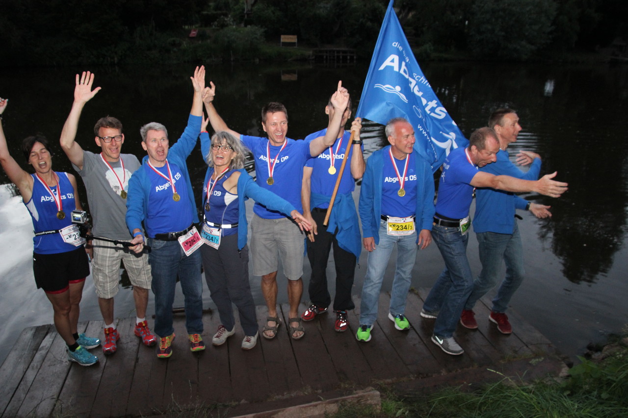Es ist Tradition dass das gesamte Team gemeinsam über die Ziellinie läuft. Zwangsläufig ist der eine oder andere Läufer um diese Uhrzeit nicht mehr im Sportmodus sondern bereits sehr entspannt. Hat vielleicht schon sein Abendessen zu sich genommen und das eine oder andere alkoholische Getränk inhaliert, so dass die Beine nicht mehr so flink sind. Und wenn dann der Zielläufer sich noch ganz in Runners High befindet und auf absoluter Adrenalinhöhe ist, hat man Probleme eine geschlossene Formation zu bilden, die ebenso geschlossen finisht.