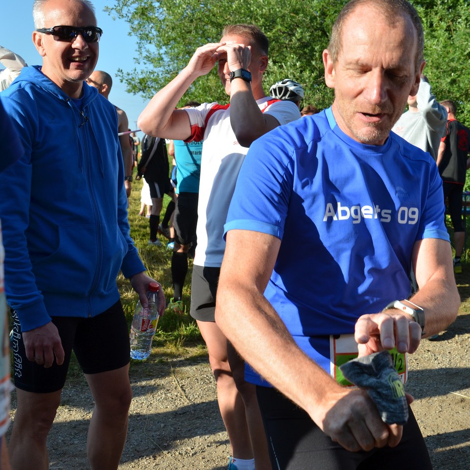 Dort habe ich mich auf mein MTB geschwungen. Es war noch nichts los an der Wechselstelle um kurz nach neun Uhr morgens. Auf der Laufstrecke bin ich dann dem Manfred entgegengefahren mit dem Plan, ihn ab seinem Start zu begleiten. Mir kamen anfangs kaum Läufer entgegen, es war eben sehr früh. Gleich der erste Streckenposten rief mir etwas zu, nach Vollbremsung und Nachfragen erfuhr ich: Er wollte die Nummer von dem Läufer wissen, der mir eben entgegengekommen war. Oh, keine Ahnung, war mir nicht wichtig gewesen. Derselbe Streckenposten hat dann bei Manfreds Lauf insgesamt dreimal von Manfred und mir die Startnummer zugerufen bekommen, einmal in Ziffern zwei-drei-vier...