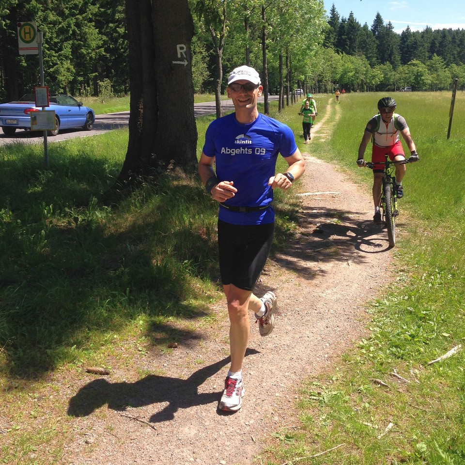 Mein Hinweg hat mir mehrere Begegnungen mit immer dem identischen Gesprächsverlauf gebracht: "Hallo! Du fährst in die falsche Richtung!" "Nein, ich bin in die richtige Richtung unterwegs, ich fahre meinen Läufer abholen!" Gemeinsames Lachen und weiter. Etwas habe ich geschummelt und bin von der Eisfelder Ausspanne bis zur Friedrichshöhe auf dem Forstweg gefahren (danke für den Tip, Thomas!). Und später dann ab den Göritzwiesen mit Blick auf die Uhr auf die Bundesstraße B281 gewechselt, Ich hatte doch nicht soviel Zeitreserve und bin lahme 1:30h gefahren. An der Wechselstelle konnte ich Manfred nicht gleich finden. Als ich mich einmal kurz umdrehte und nach meinem Rad sah, sauste er schon hinter mir vorbei!
