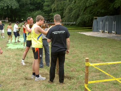 Es wurden verschiedene Wettkämpfe angeboten - auch für Kinder. Dadurch wurde das Erlebnis Sommerbiathlon ein echter Familientag. Gemeldet hatte ich anfangs für den Wettbewerb über 5500m und dem später folgenden über 2300m. Auf der 5500m Langstrecke musste man einen 1.375m langen Rundkurs insgesamt vier mal durchlaufen. Der Kurs war sehr wellig, die Bodenbeschaffenheit recht uneben und als Sprintstrecke eher ungeeignet. Zu Beginn der Runde ging es 300 m stark berab, anschließend das Ganze wieder 900m lang bergauf, bevor man auf den letzten Metern wieder versuchen konnte, den angestrengten Puls etwas zu beruhigen. Gerade bei dem schwülwarmen Wetter war das kein Zuckerschlecken. Die Intervallpausen erfolgten am Schießstand. Bei den Schießeinlagen 2x stehend und 1x liegend mussten fünf Schuss aus einem Luftgewehr pro Stopp abgefeuert werden. Das Ziel: 35 mm große Klappscheiben, 10 Meter entfernt. Als Bestrafung für jede nicht gefallene Scheibe durften die laufenden Schützen eine Runde mit 70 m extra drehen. Meine Schießleistung war relativ bescheiden. Mit 1/2/2 Schießfehlern habe ich ein Drittel der Schüsse verseppelt und durfte 350m dranhängen. Meine Zeit von 27:05 Min. reichte für Platz 9 gesamt und in der Klasse Männer II für den 3. Podestplatz. Als Belohnung dafür wurde mir eine hölzerne Erinnerungsmedaille, ein 75 Euro Gutschein (damit ich mich beim Schützenverein Bingen anmelden kann) und eine Tüte Gummibärchen überreicht.