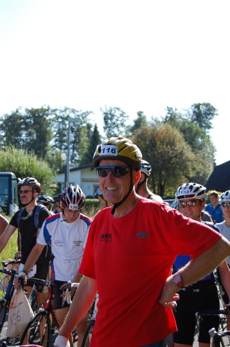 Es waren nach meiner Meinung schon sehr viele Triathleten dabei, alle hervorragend ausgestattet. Man sah viele sehr gute Rennräder, nur einige wenige Mountain-Bikes bzw. Trekking-Räder. Sehr viele Teilnehmer mit spez. Triathlon-Badeanzügen, spez. Helme mit Spoiler etc. Hans-Jürgen und ich dachten, na ja, bei so vielen Profis werden wir dann irgendwie am Ende ankommen.